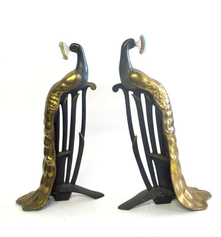 Pair of patinated, gilt bronze and turquoise mounted peacock andirons second half 20th century