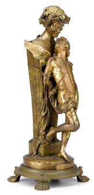 Gilt bronze, distressed patina, signed in cast F. Sanzel, bearing title plaque "Amour Captif pa F.Sanzel, Statuaire, Medaille d'Or au Salon", raised on circular base on paw feet.