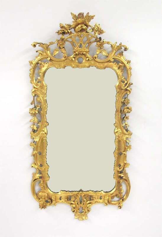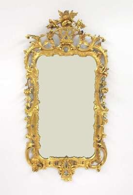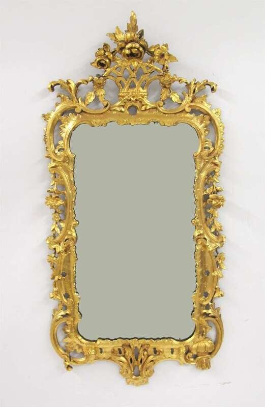 The mirror plate enclosed within a C-scroll and foliate openwork frame surmounted by a floral basket.