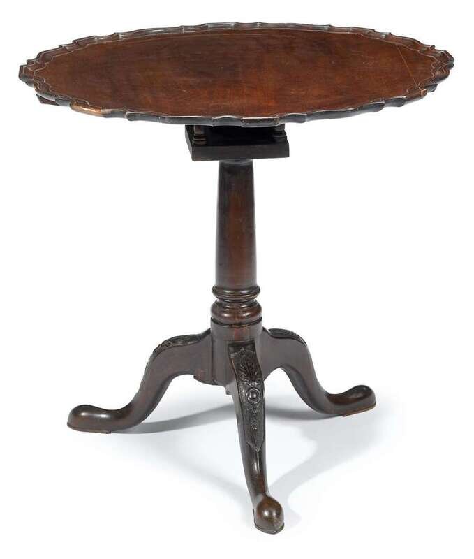 The circular top with pie crust edge, over bird-cage action and turned baluster support issuing three acanthus and husk carved downswept legs terminating in pad feet.