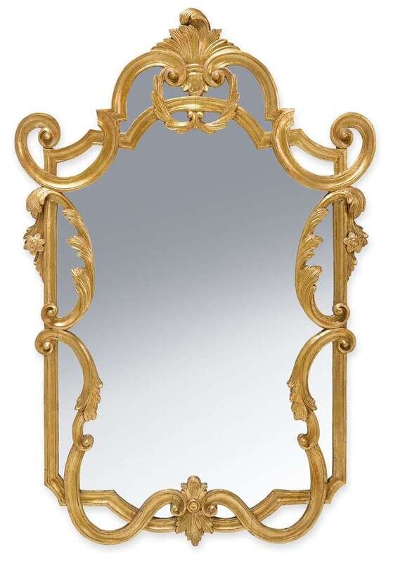 The shaped mirror plate enclosed within a C-scroll and acanthus leaf molded frame.