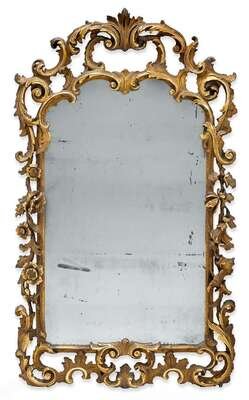 The shaped mirror plate within a C-scroll, acanthus leaf, and floral blossom frame.