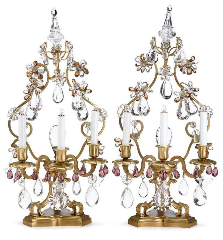 With three S-scroll arms raised on three scroll supports and tripartite base, hung with colorless, purple, and quartz colored drops.