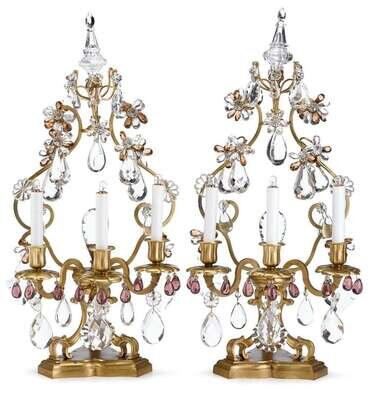 Pair of gilt bronze and glass luster three light girandoles 20th century