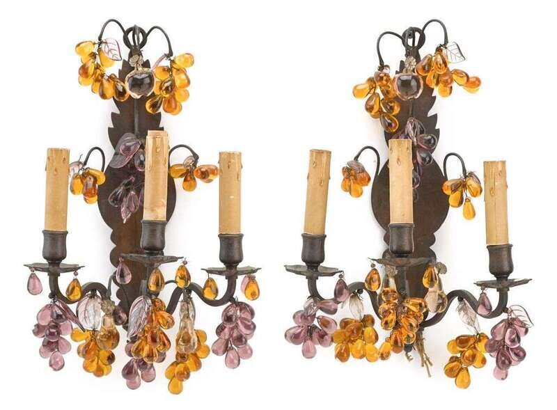 The shaped bronze backplate issuing three candle arms and a series of colored glass fruit clusters, the back stamped "Made in France", "BO".