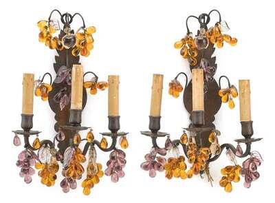 Pair of French bronze and colored glass three-light sconces early 20th century