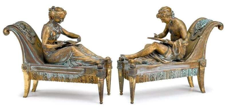 Cast as male and female scholars on chaise longues, the backrest with wreath trophy mounts, impressed mark "Bouhon Fres".
