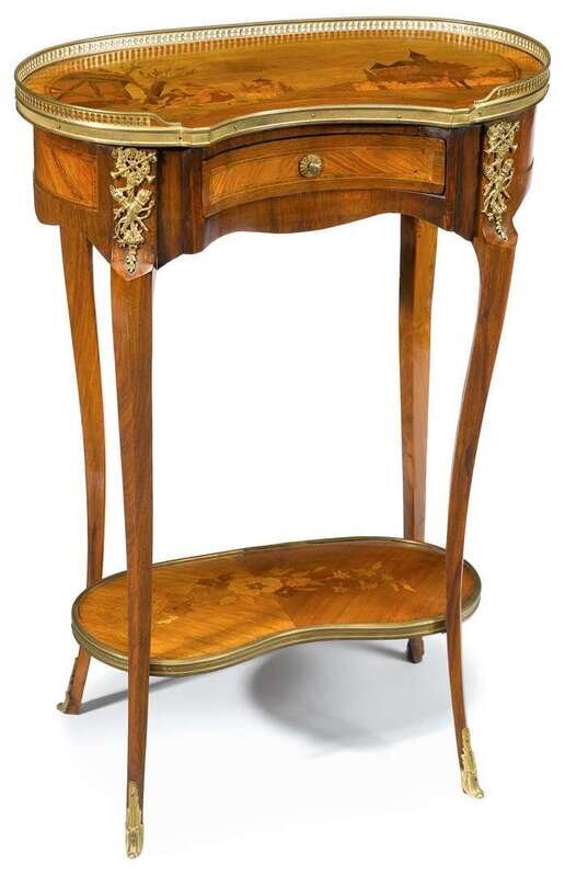 The kidney-shaped top with three quarter gallery, marquetry inlaid to show a couple in a bucolic setting, above single drawer, raised on slender cabriole legs united by undertier and terminating in sabots.