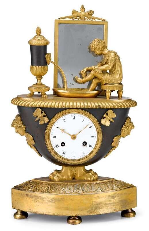 The case surmounted by a gilt bronze figure of a boy seated and washing his feet with a sponge, as a water urn opposite him issues water from a fountain head, a large mirror stands beside him, above circular white enamel dial with Roman numerals, surrounded by insects and with a female mask at each side, raised on two paw feet, supported on a lozenge shaped base with egg and dart edge, raised on flattened bun feet.