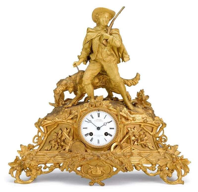 French gilt bronze mantle clock "Hunter and Dog" paris, mid-19th century, dial signed c. detouche