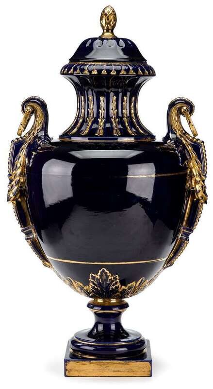 Monumental Sevres style cobalt and gilt porcelain covered urn 19th century