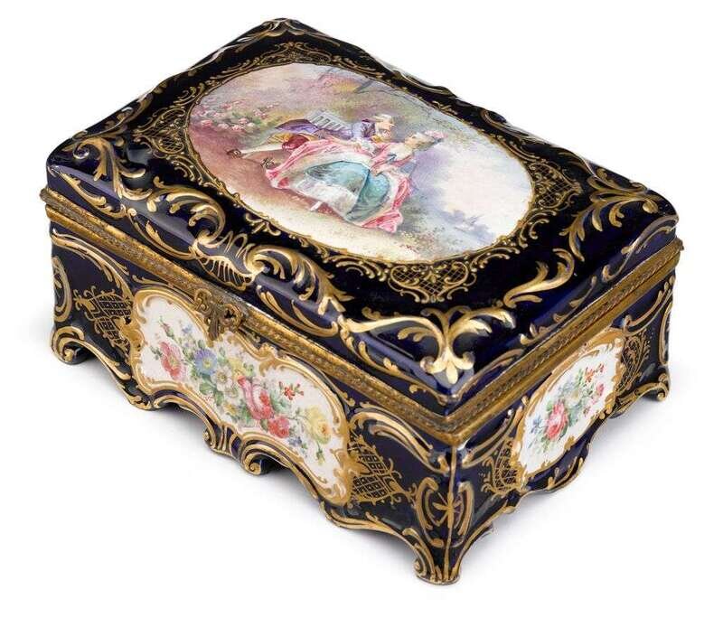 The hinged top painted with a courting scene against a cobalt ground with raised and gilt painted foliate scrolls, floral bouquets painted to plaques on sides and interior, raised on scroll feet with gilt interlaced mark to underside.