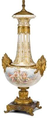 Mounted as a lamp, the body painted to one cap side with Bacchic putti in a romantic landscape, the reverse painted with a fruit basket and musical trophy, the shoulders mounted with twin caryatid masks, supported on a socle and champleve enameled square base terminating in scroll and acanthus leaf-cast feet.