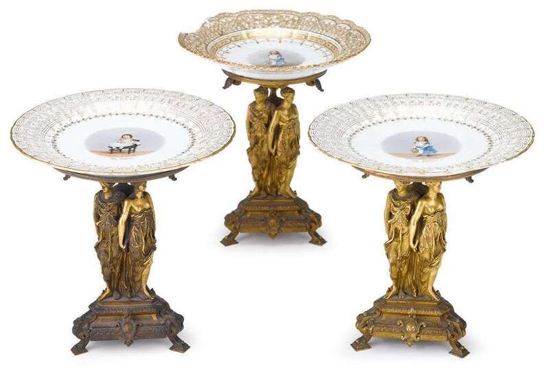 Each standard composed of figures of the three muses standing holding hands, surmounted by circular top with inset hand-painted Le Rosey porcelain dishes, raised on tripartite base on paw feet, the underside stamped "Prosper Roussel, Place Vendome, 26".