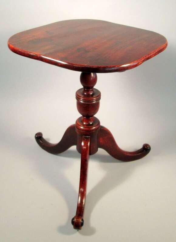 The square top with rounded corners over baluster and ring-turned support, raised on three outswept legs.