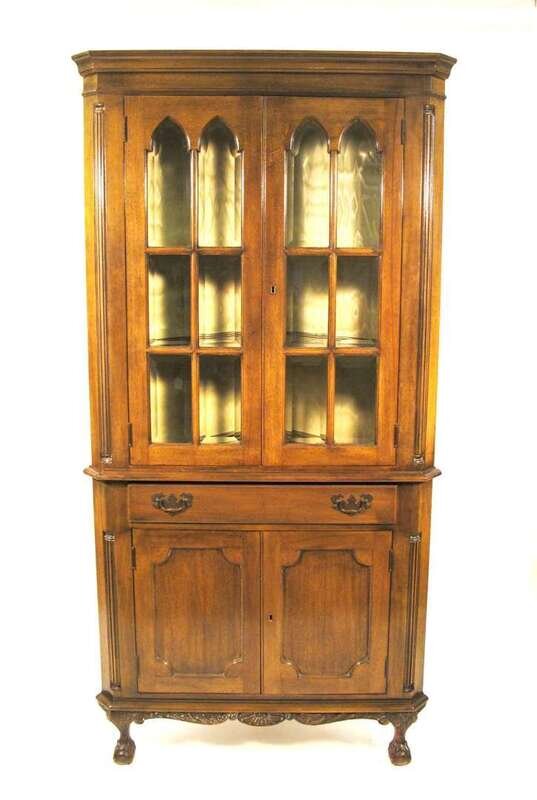 The triangular shaped top over conforming case in two parts: the upper section with twin glazed cupboard doors opening to two shelves above lower section with single long drawer over twin paneled doors opening to single shelf interior, raised on squat cabriole legs terminating in ball and claw feet.