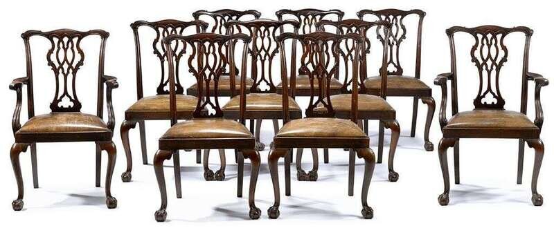 Comprising two arm and eight side chairs, the shaped top rail over interlaced vasiform splat above trapezoidal leather-upholstered slip-seat on cabriole legs terminating in ball and claw feet.