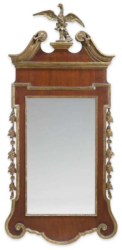 The paterae and acanthus carved swan neck pediment centered by a carved giltwood eagle over shaped frame with gilt edge of bellflower husks enclosing a rectangular mirror plate.