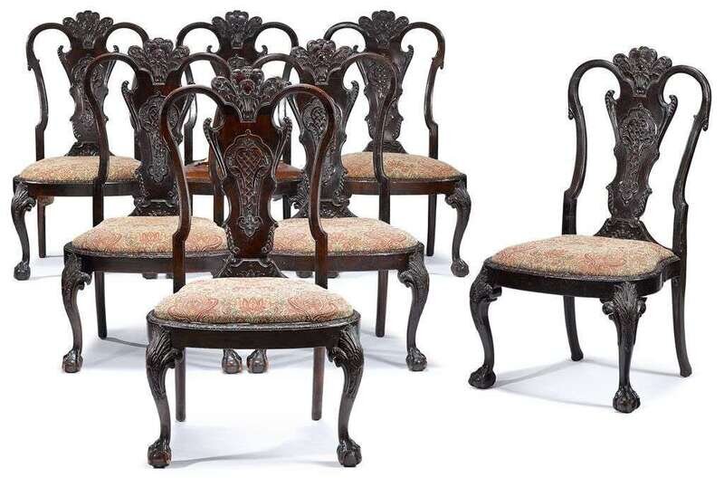 An elaborately carved set of George II style mahogany dining chairs