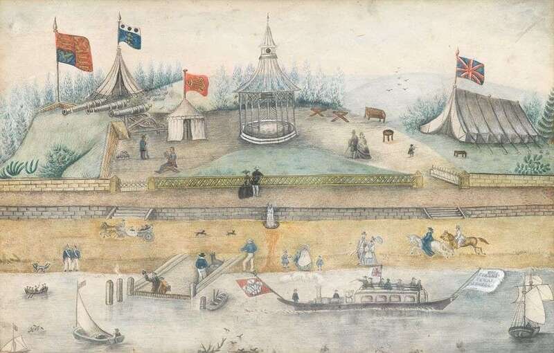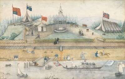Apparently unsigned, the verso of frame with applied paper label "Encampment on Thames at Windsor, circa 1880" and illegibly pen inscriptions "P. Van Rensselaer", etc.