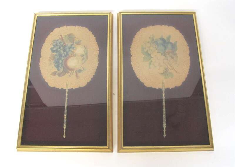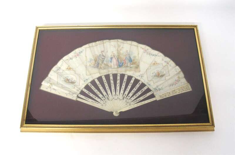 One with carved bone sticks and guards, painted with a scene of a soldier greeting a maiden in an idyllic setting, the other two with painted fruit bunches on a Lyre and scroll-pressed oval paper fan, all framed.