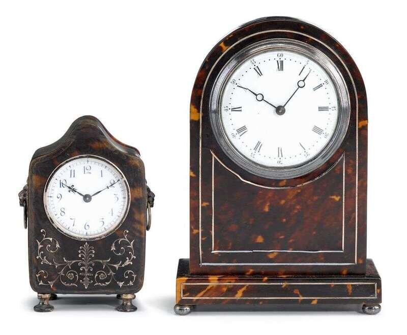The desk clock with circular porcelain dial with Roman hours, Arabic minutes and brequet hands within an arched silver line-inlaid tortoiseshell case supported on silvered bun feet, the brass movement unmarked; the travel clock with circular porcelain dial with Arabic hours and fleur-de-lis hour hand, within an arched tortoiseshell case with silver bellflower and scroll marquetry inlay, the case with twin lion's mask and ring mounts, supported on silvered feet, the brass movement stamped "French Movement" with lion.