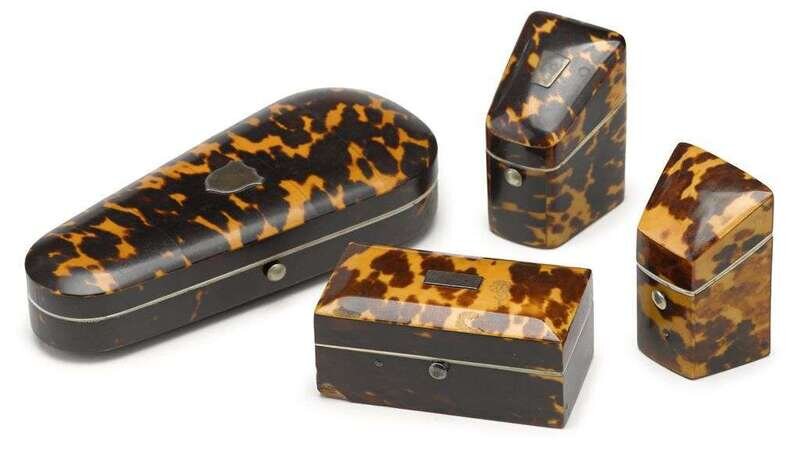 Comprising a pair of scissors in a tortoiseshell case signed "Lund 57 Cornhill London"; two small cases, one fitted for needles the other for a thimble (present); and a small rectangular box. (4).