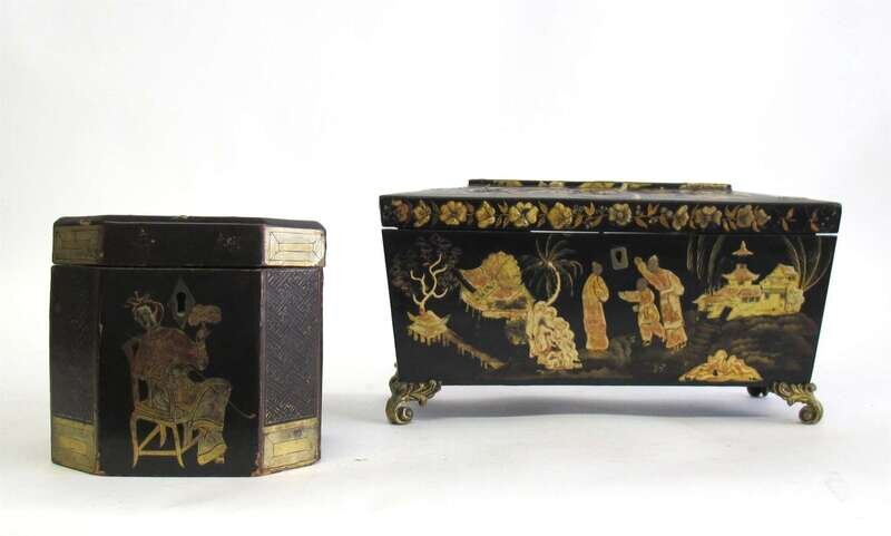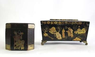 The larger of sarcophagus form the body decorated with gilt and gessoed floral blossoms, pagoda, and figures in a landscape, the hinged top opens to an interior with fitted compartment; the other caddy of hexagonal shape, the lid with a circular medallion, the sides with alternating panels of geometric and figural decoration, opening to lidded pewter insert.