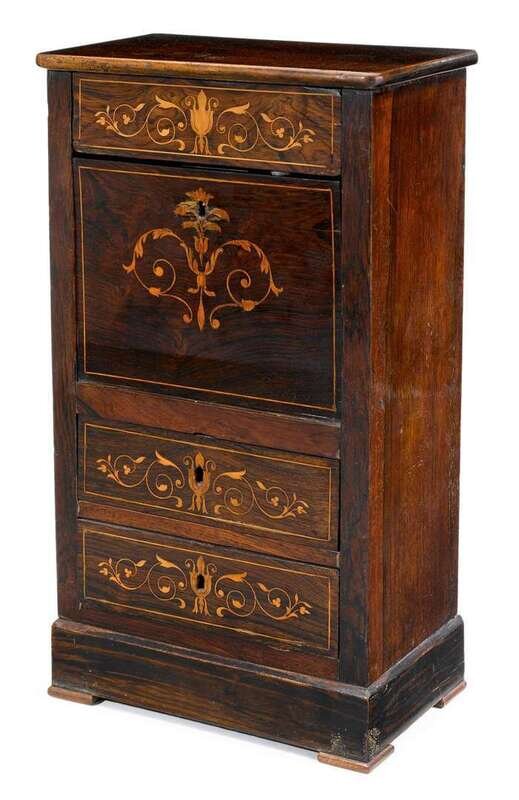 Rectangular form with three drawers and fall-front writing surface, opening to a recessed shelf and mirror plate, the drawer fronts with floral and vine inlay.
