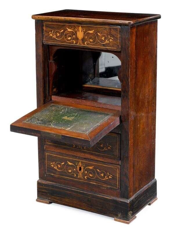 Miniature Regency period rosewood and satinwood inlaid secrétaire à abattant circa 1820