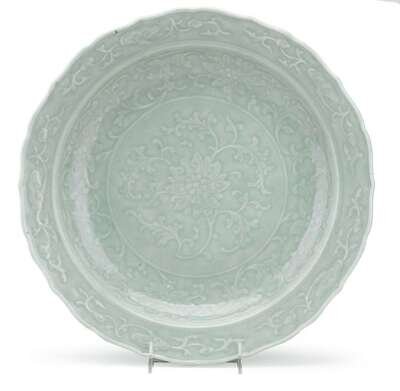 The large dish of typical form with barbed rim and carved throughout with lotus blossoms, scrolling vines and lingzhi.