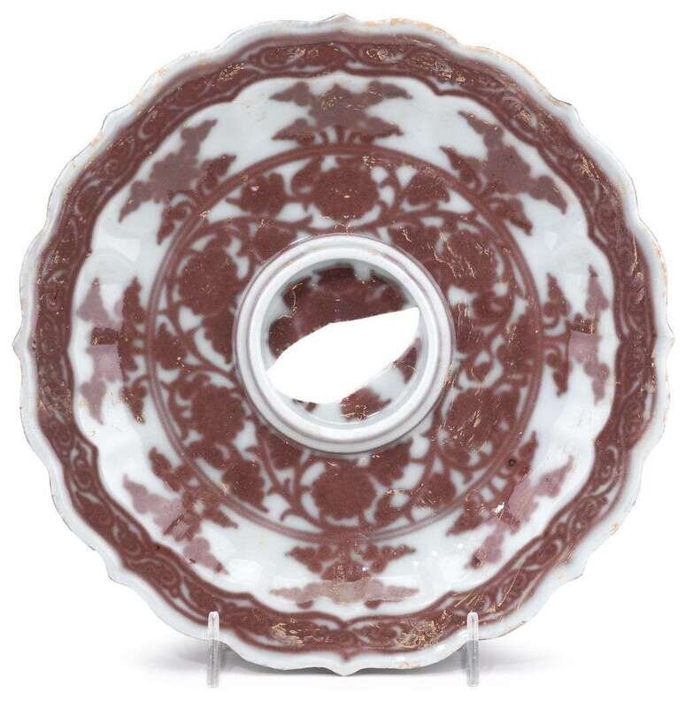 The floral form stand decorated with stylized flowers and foliate bands to interior and lappet band to exterior.