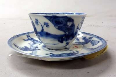 Decorated with figural scenes, together with a blue and white cup with high footring and decorated with beast motifs.