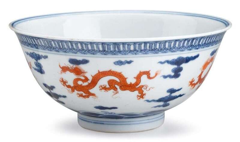 Painted in red with four dragons chasing around the exterior of the bowl amongst underglaze blue cloud scrolls, the interior medallion with a solitary dragon.