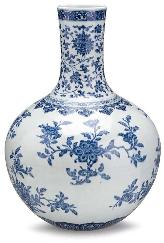 Painted in Ming style with scrolling lotus motifs above flowering and fruiting 'sanduo' sprays, with wave band at mouth, ruyi band at shoulder and lappet band near base.