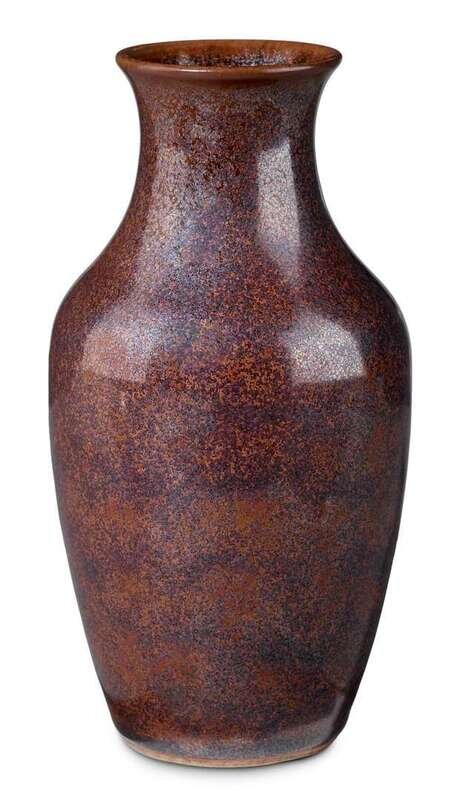 Covered to exterior and interior mouth with a reddish brown glaze, speckled with iridescent mirror black flecks in imitation of bronze, the glaze neatly trimed near base exposing smooth porcelain body.