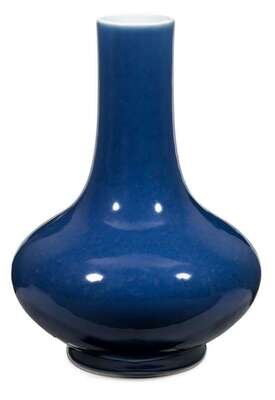 Of squat, bulbous form with cylindrical neck, covered in a thick monochrome blue glaze.