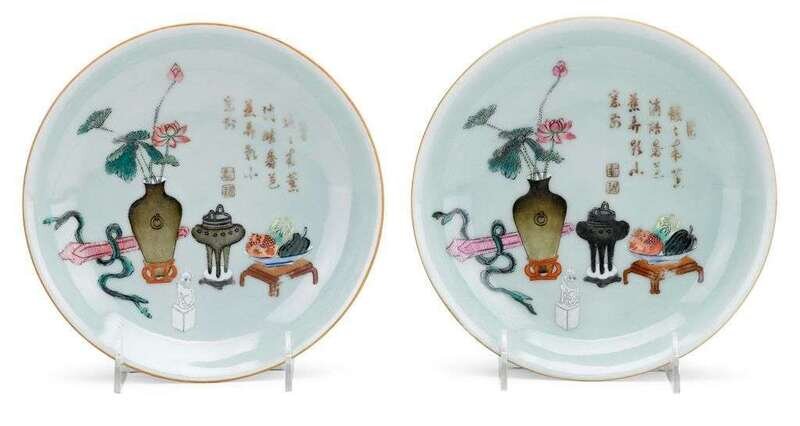 Pair of celadon ground famille rose dishes qianlong mark and of the period