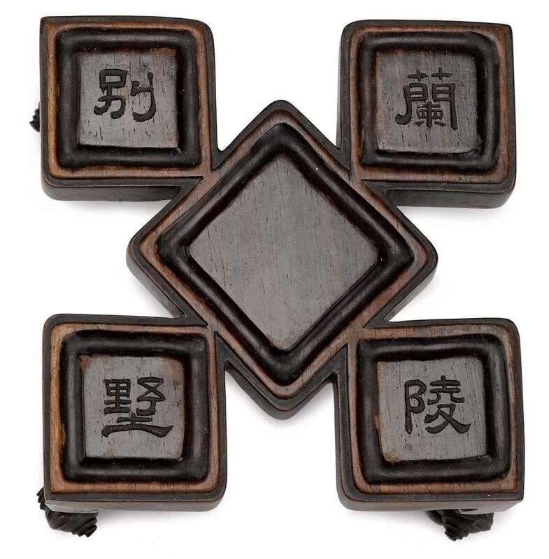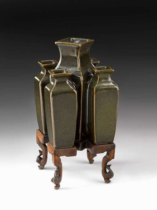 The larger central section of square baluster form with four smaller vases of similar form isuing from flat sides; teadust glaze of dark and even tone; with accompanying fitted rosewood stand carved with scrolled legs and characters to platform indicating property from the Lanling Bieshu.