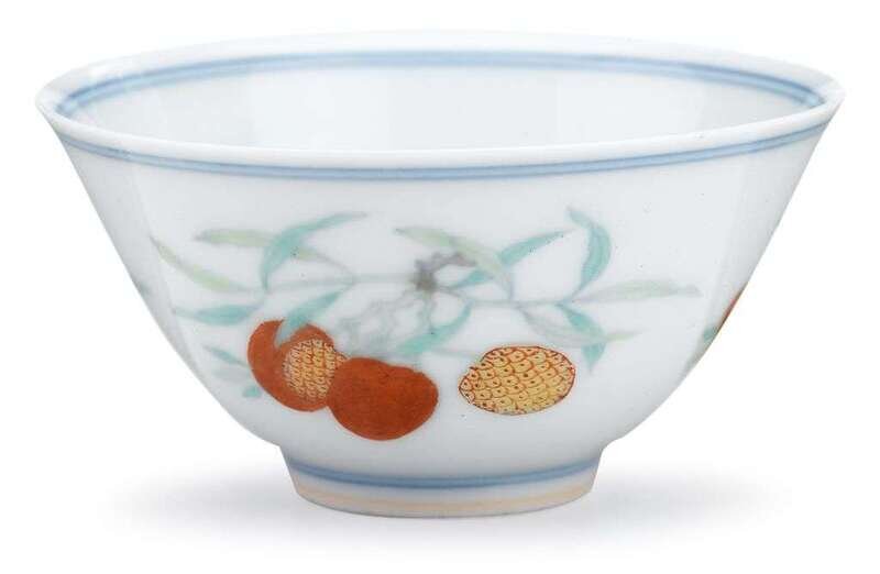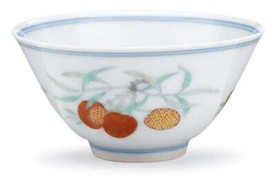 Thinly potted conical form, enamelled on the exterior with the 'sanduo' mofit -- peach, citrus and lychee on leafy sprigs; the interior with a central medallion depicting a rose.
