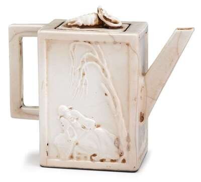 Of rectangular form with a C-shaped handle and tapering spout; of white craquelure glazed, depicting a sage resting under a tree, a meiren verso, the cover surmounted with a moulded qilong dragon.