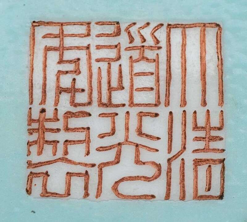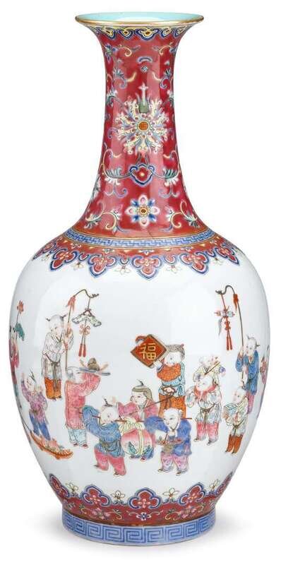 The oviform body finely enamelled with boys at play; some boys are shown carrying large fruits such as peach, pomegranates and lychee, others with lanterns, lotus flowers, musical instruments, fu character and other auspicious objects; between ruyi borders; the tall waisted neck painted with flower sprays reserved on a ruby ground, the interior of the neck in turquoise enamel.