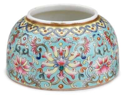 Dome shape, turquoise ground enamelled with Indian lotus scrolls and a stylized lingzhi band around rim.