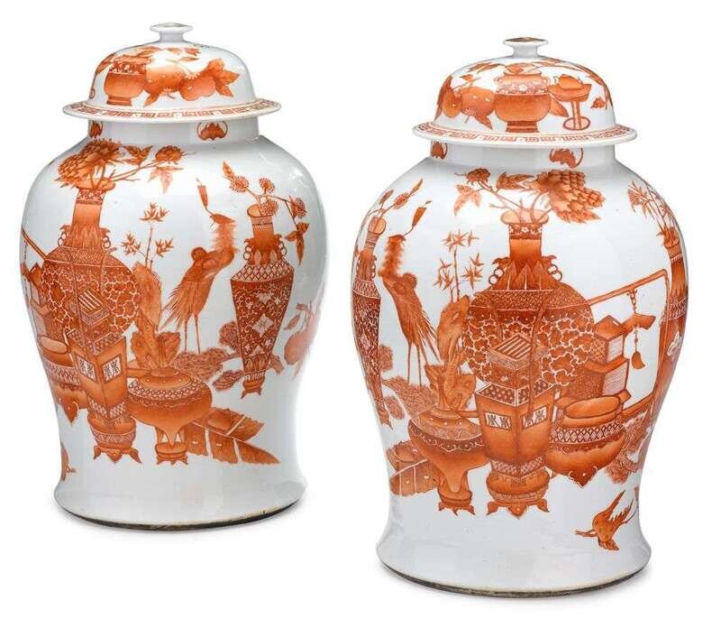 Matched pair of Chinese iron red decorated porcelain covered jars 19th century