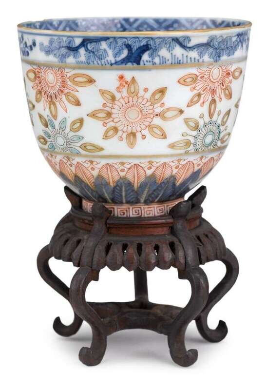 Rice flake bowl polychrome and gilt painted on the exterior with export stylized floral motifs, between a blue and white band to mouth depicting 'three friends' and an iron red and blue double lappet band near base.