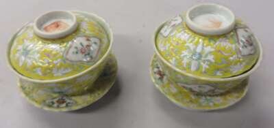 Pair of Chinese yellow ground porcelain cups with stands and covers late qing dyansty