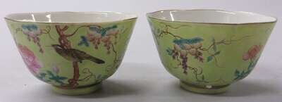 Lime green ground enameled with birds among peony flowers and fruiting sprays.