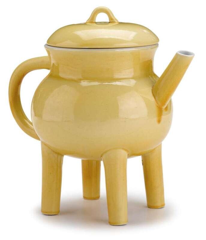 The ewer with globular body supported on columnar legs with plain spout and handle, covered in a lemon yellow glaze.