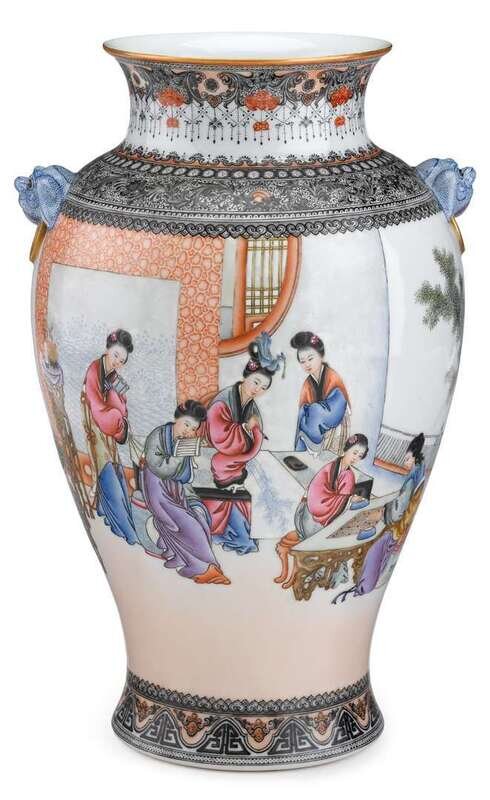 The baluster form vase decorated with sgraffito to neck and base, and painted to body with a group of nine ladies engaged in 'qin, qi, shu, hua' or music, chess, calligraphy and painting, with double fu dog handles and faux rings.