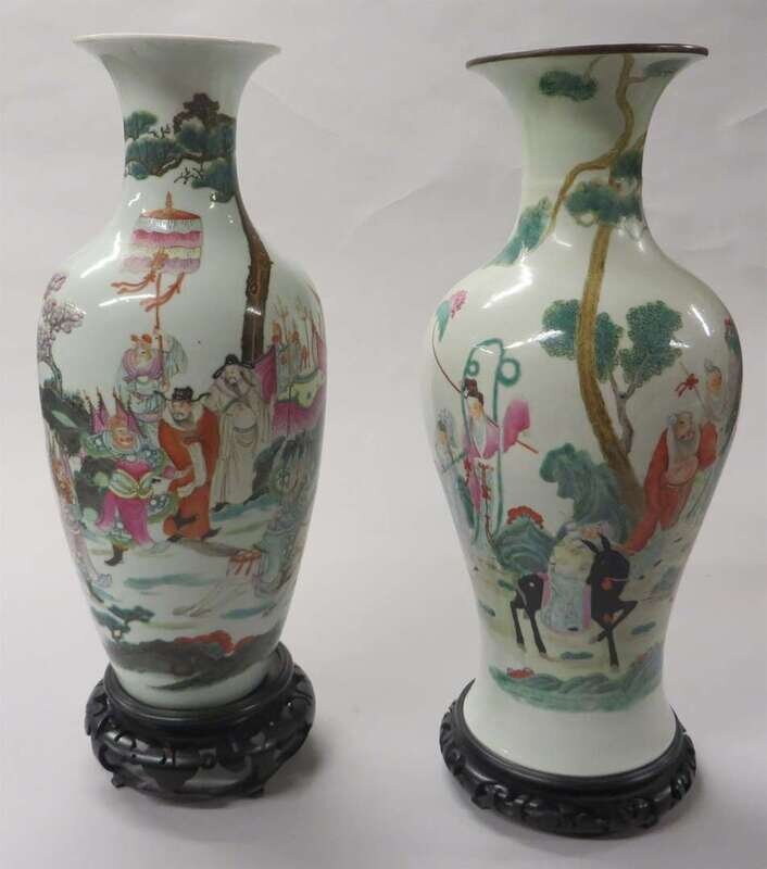 Including a baluster form vase enameled with the eight immortals and with 'Ju Ren Tang' mark at base; together with an ovoid vase depicting a war scene.